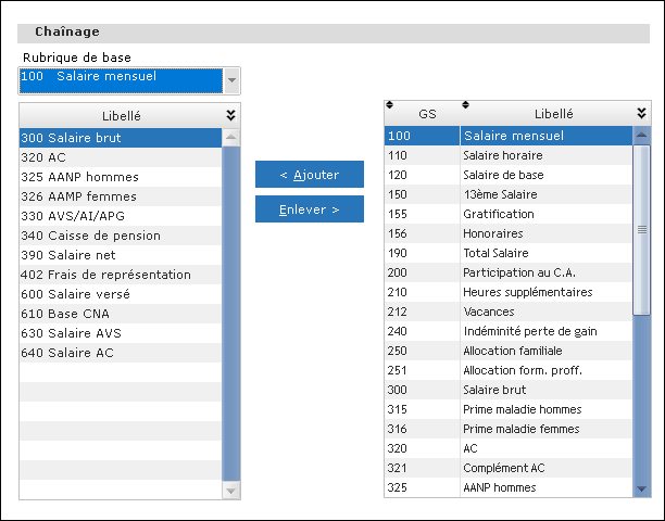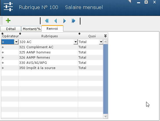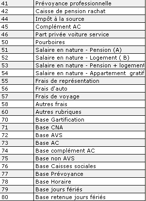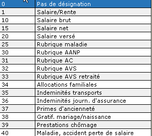 Certaines rubriques viennent s’afficher automatiquement, tels qu’ AC, AVS/AI/APG, etc.. Ces rubriques sont contrôlées par les différents codes introduits dans la fiche personnelle de l’employé (par ex. code AC, CNA, AVS, etc…). Si vous ne désirez pas traiter l’une de ces rubriques, vous ne devez pas la supprimer, mais lui introduire un montant ou un taux nul.