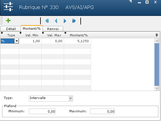 On peut aussi s’imaginer avoir des employés étant rémunérés en pourcentage (par ex. dans la restauration). Supposons que tous les employés ont le même pourcentage : on définit alors dans les rubriques de salaire que l’unité est en pourcent ( % ) et que le taux est, par exemple, de 13.05 %. On n’aura pas besoin d’ouvrir cette rubrique pour l’employé, mais nous traiterons le chiffre d’affaires dans les mouvements mensuels.